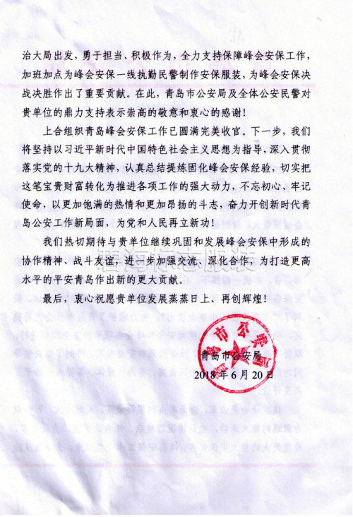 青岛市公安局感谢信