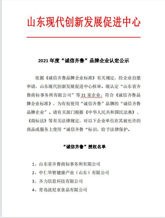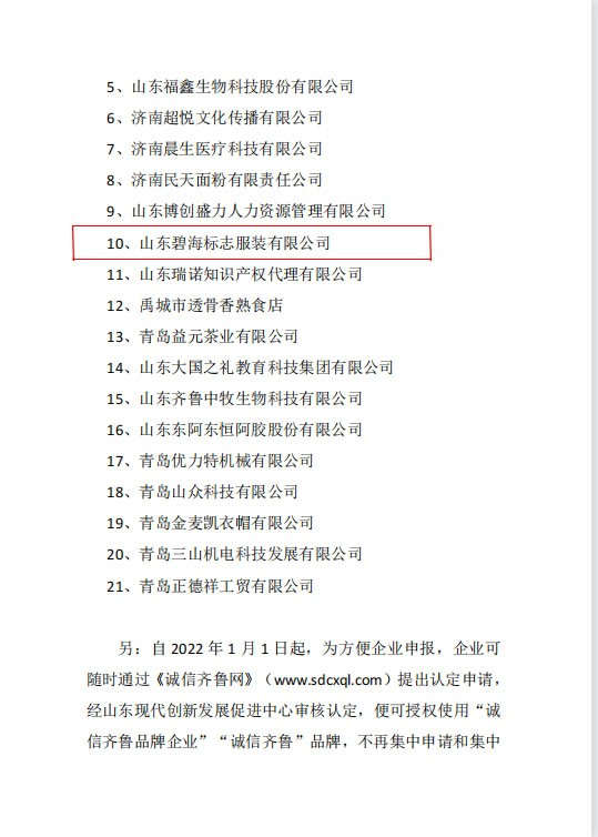 为推动企业创新驱动、技术创新、自主品牌建立,达到山东省新旧动能转换,省内经济高速发展,自2021年07月,全省内开展“诚信齐鲁”品牌企业认定暨“诚信齐鲁”区域品牌授权工作。由企业自愿申请参加。首轮认定中,依据《诚信齐鲁品牌企业标准》有关规定,经山东现代创新发展促进中心核审,山东碧海标志服装有限公司经审核符合《诚信齐鲁品牌企业标准》,为有权使用“诚信齐鲁”品牌的“诚信齐鲁品牌企业”。公示文件如下: