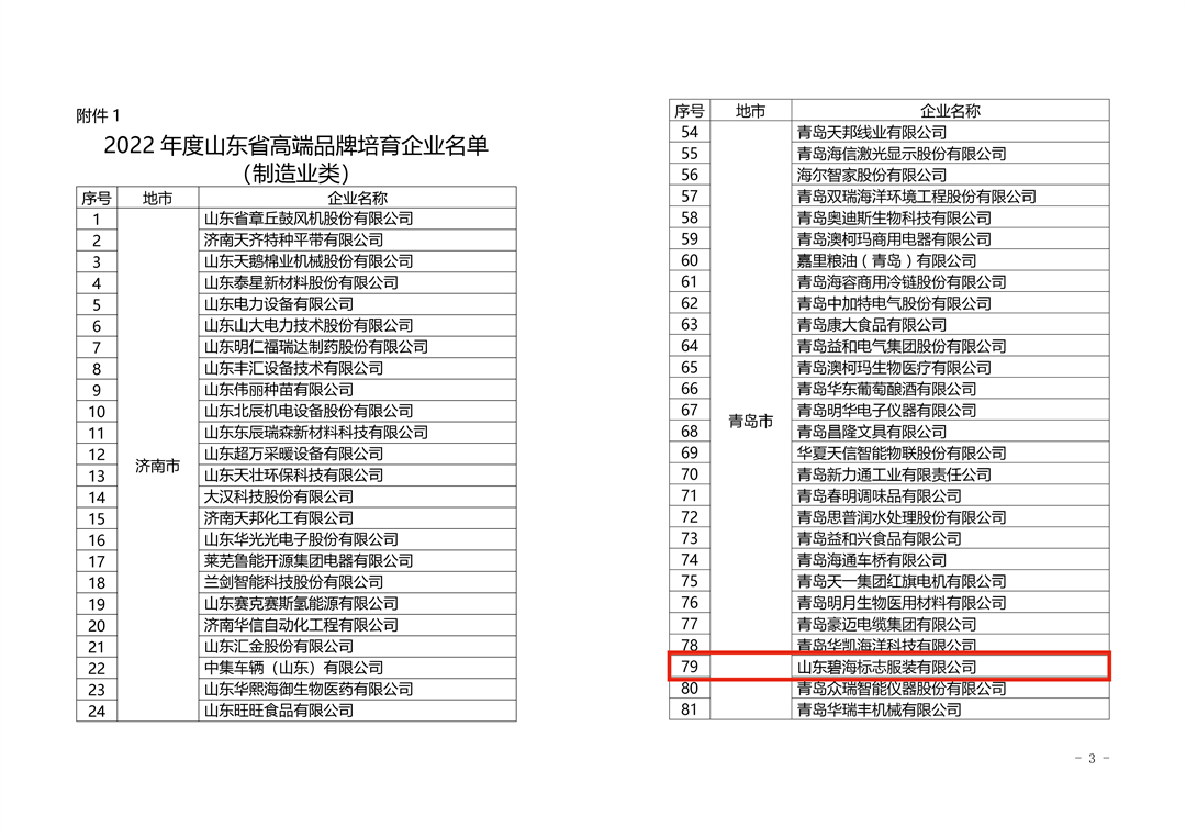 为加强“好品山东”建设,推进我省品牌高端化。2022年07月05日,山东省市场监督管理局发布了2022年山东省高端品牌培育企业评选结果。山东碧海标志服装有限公司荣获2022年山东省高端品牌培育企业认定(制造类)。#碧海服装#