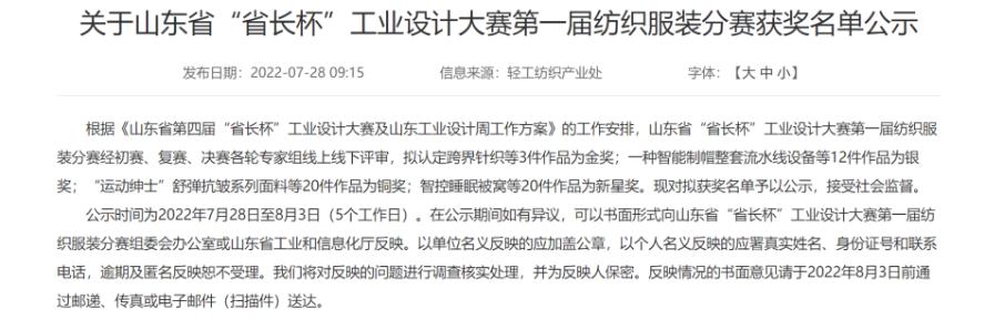 近日来,由山东省人民政府主办,中国工业设计协会支持,山东省工业和信息化厅、山东省教育厅、山东省财政厅、山东省市场监管局、山东省总工会、共青团山东省委、山东广播电视台承办的,山东省各市工业和信息化局、山东省工业设计协会协办的山东省“省长杯”工业设计大赛第一届纺织分赛落下帷幕。