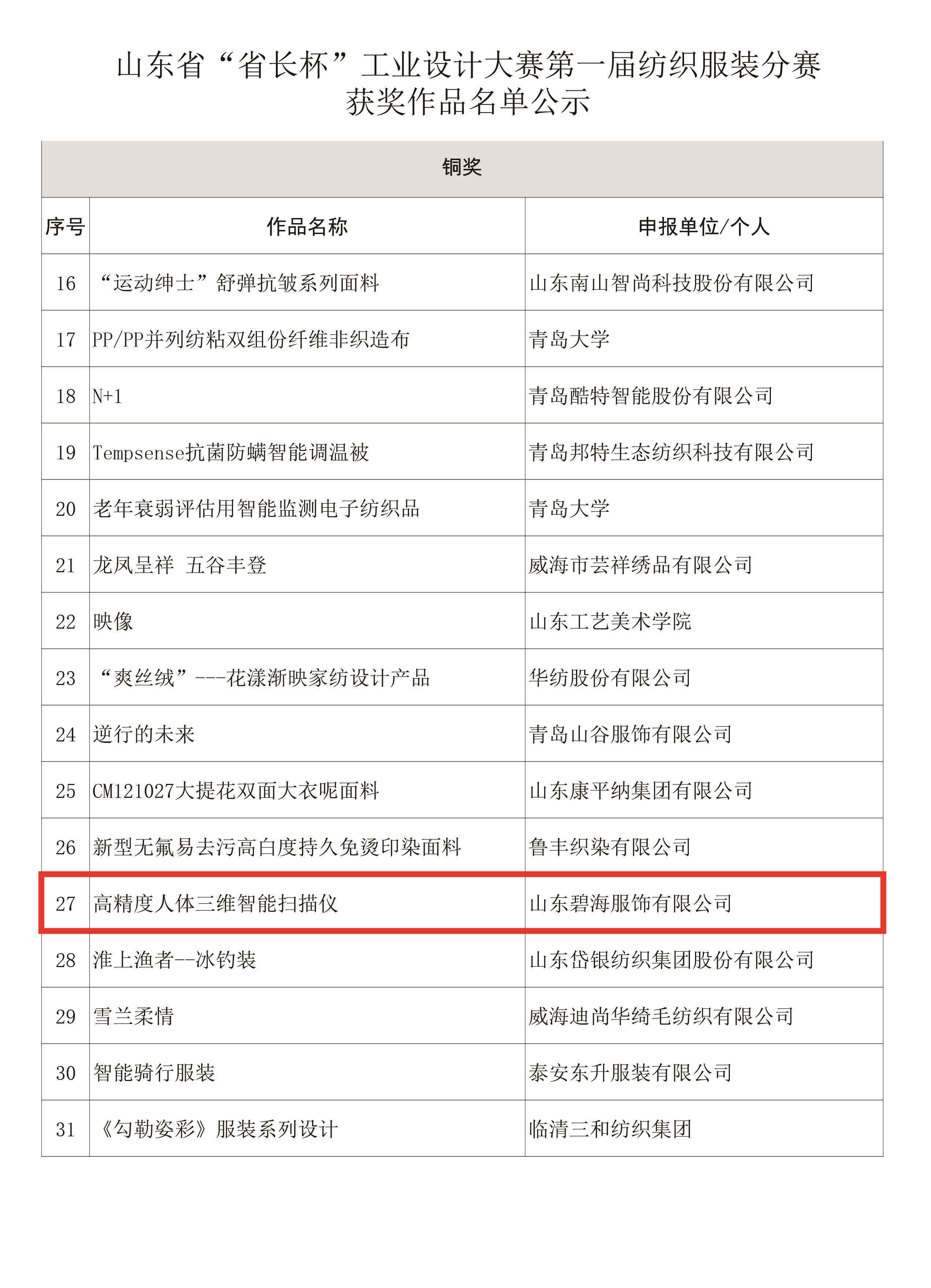 山东碧海标志服装有限公司喜获山东省“省长杯”纺织分赛铜奖