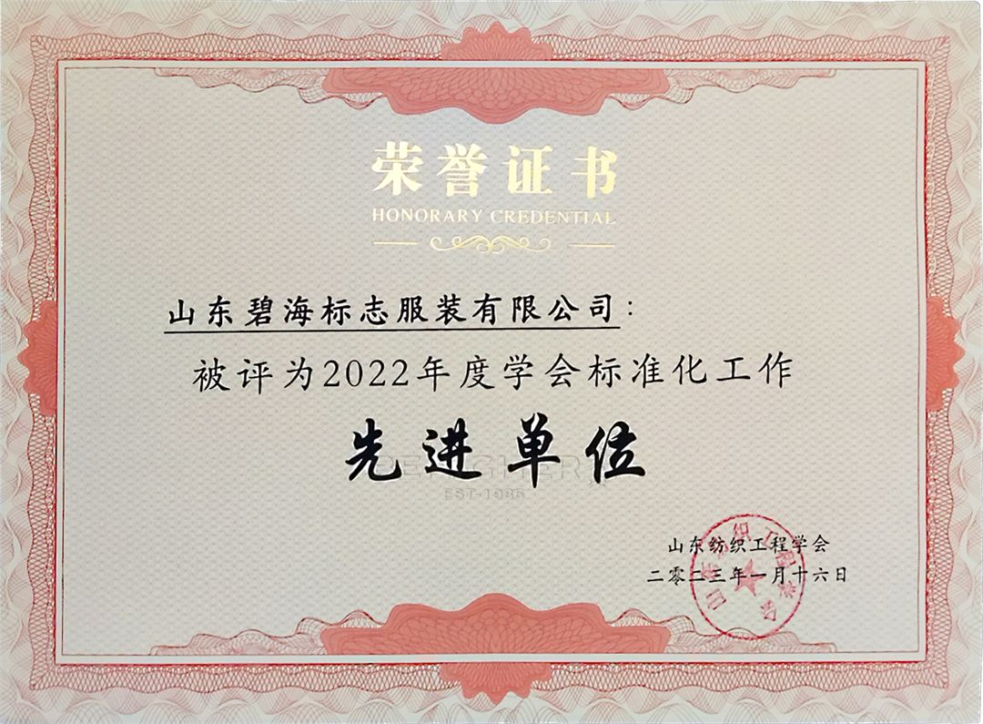 2023116日,山东纺织工程学会——2022年度学会标准化工作先进单位名单揭晓。经学会综合评审,山东碧海标志服装有限公司获得“#2022年度学会标准化工作先进单位#”荣誉称号。